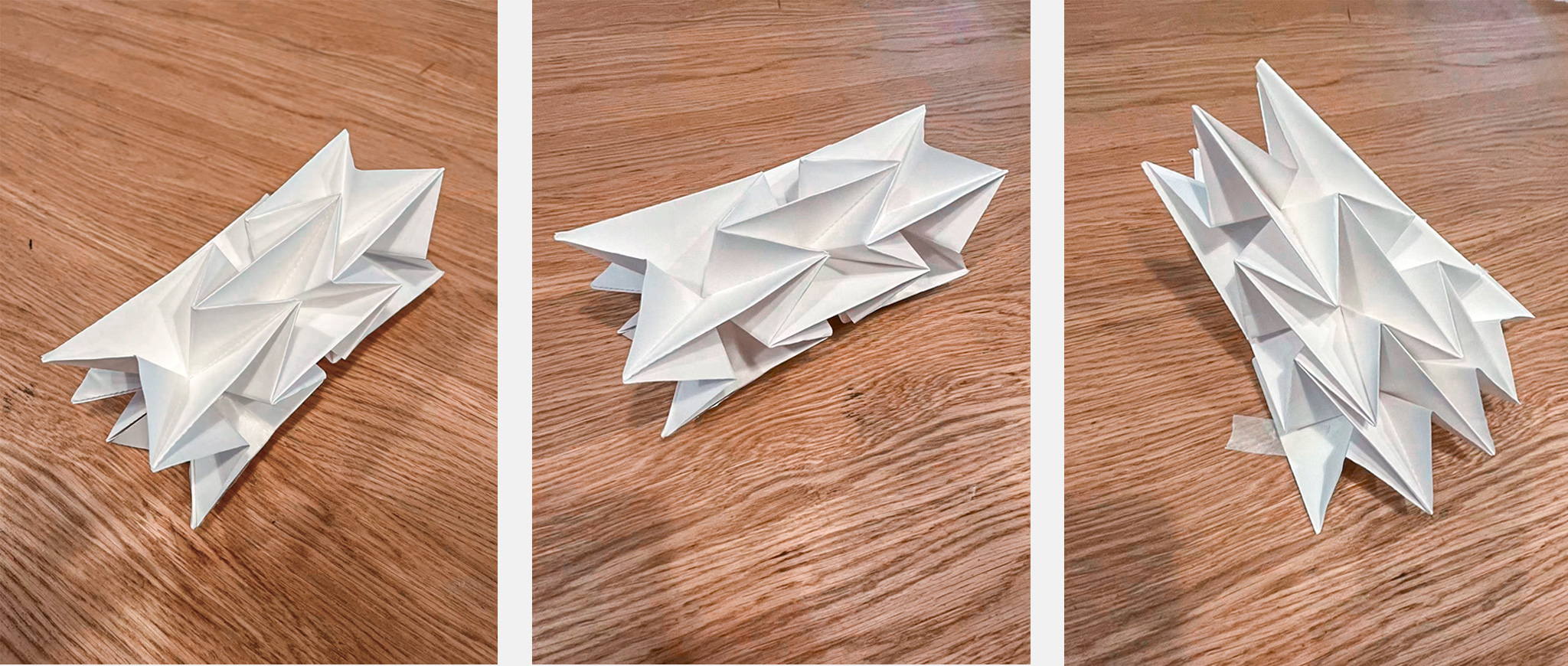 在這短短兩行字之後曾發生了無數次的血淚與放棄,比如布料太厚導致折線無法對齊、布和紙的張力在拉扯而導致紙張破裂、由於折線設計過於特殊導致摺景工法無法製造、熨斗高溫燙一下之後膠直接融化、熨斗低溫微燙布料和紙分開後卻沒有留下摺痕.....